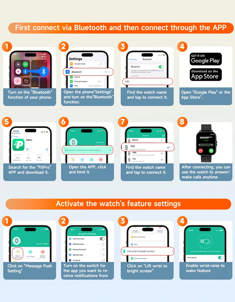 GLORYFIT introduces a feature-packed smartwatch designed for fitness and communication, with functions including passometer, sleep tracker, message and call reminders, and more. Equipped with a heart rate monitor, blood oxygen and pressure monitor, and various activity trackers, it ensures comprehensive health monitoring. With multilingual support and compatibility with Android devices, this smartwatch offers versatility. Its sleek design, square TFT display, and waterproof feature make it suitable for everyday wear. With the FitPro app available for download, users can customize their experience. Trust GLORYFIT for a reliable and functional smartwatch solution.
